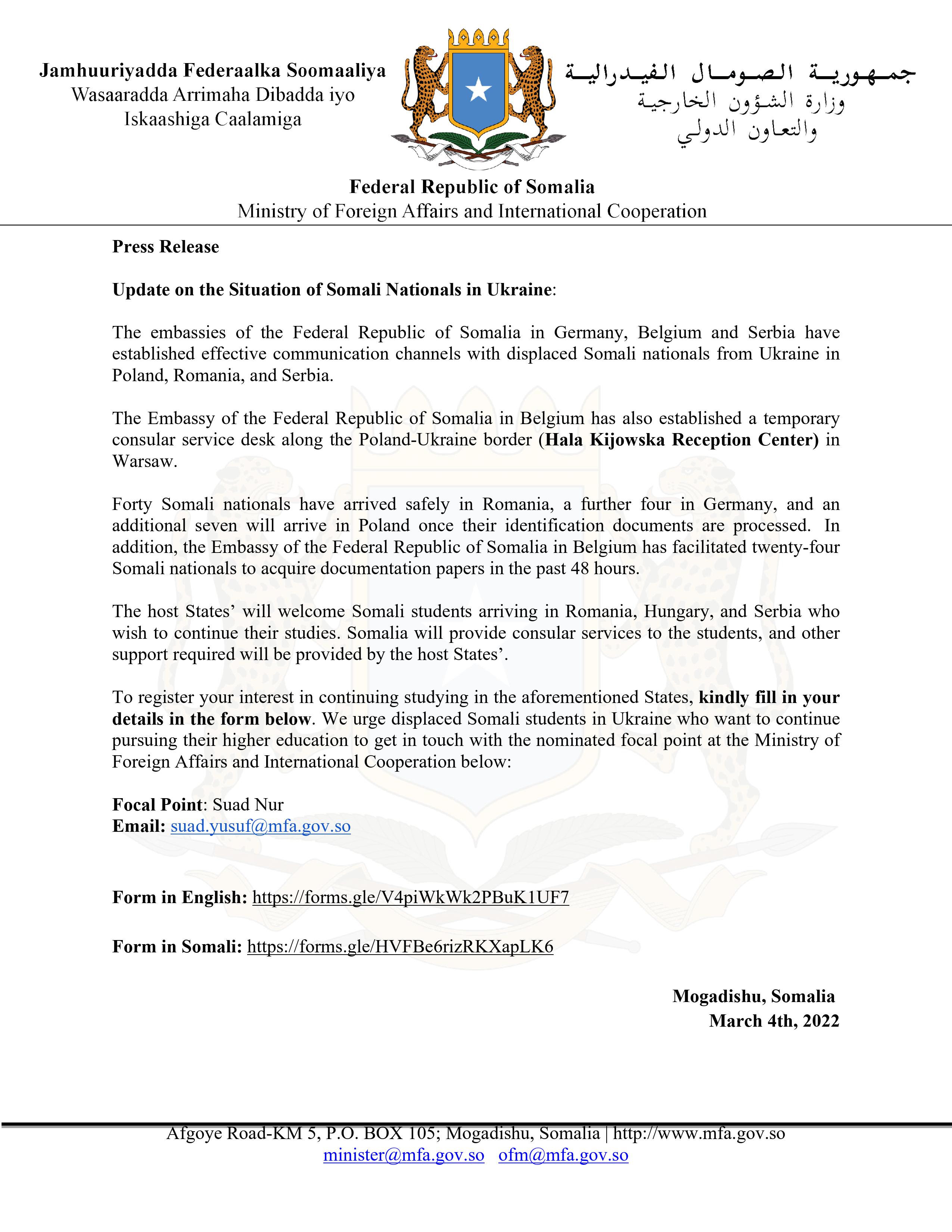 Mogadishu (Diplomat.so) - A press release issued today by the Ministry of Foreign Affairs and International Cooperation of the Federal Republic of Somalia has provided updates on its citizens in Ukraine.