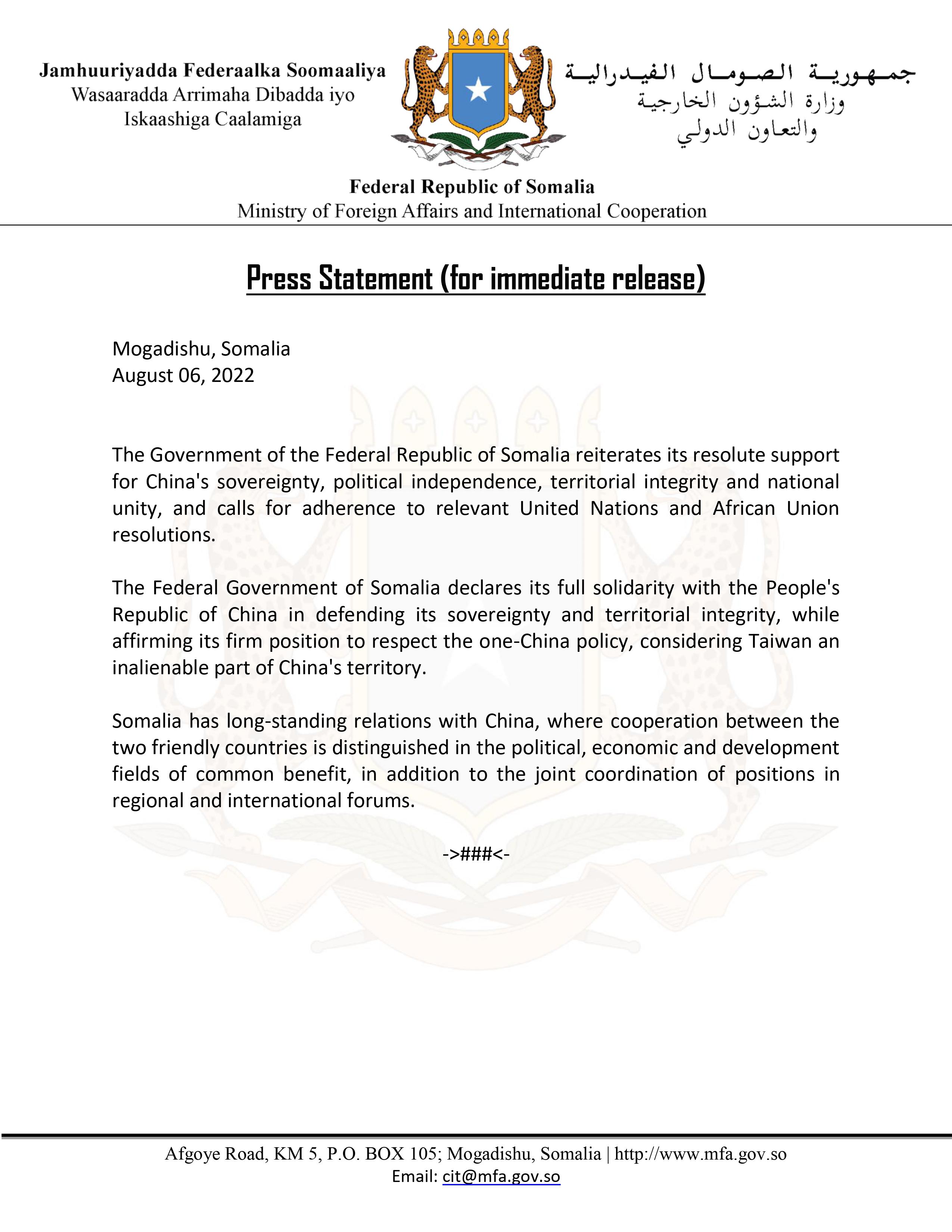 The Federal Government of Somalia declares its full solidarity with the People's Republic of China in defending its sovereignty and territorial integrity, while affirming its firm position to respect the one-China policy, considering Taiwan an inalienable part of China's territory.